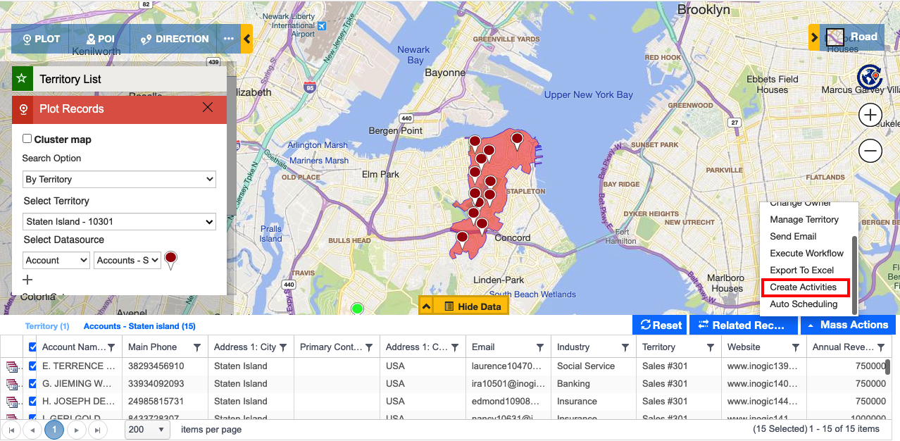 Moreover, they can create activities if they need like Appointments, Tasks or Phone Call right through the map for all the records using ‘Create Activities’ from the Mass Actions.