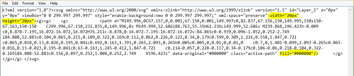 You can either download it from free site or you can create your own pushpin. While creating or downloading any pushpin, the size of the pushpin should be equal to or less than 20 px in width, and 30 px in height. Once you have .svg pushpin, right click and open the same pushpin in notepad which will be shown as depicted below.