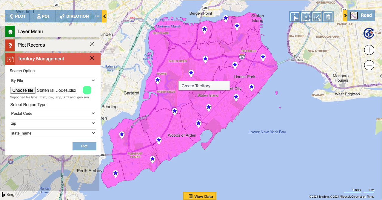 Let’s understand this with a use case. Adam is the sales manager of a chain of restaurants called ‘Colossal spice’. He manages the store supervisors who handle their assigned restaurants. As some new restaurants have been opened, he has to create territories for his store managers to handle. He plots the restaurants on the map along with the excel sheet with the postal codes within the area. He selects the regions using the alignment tool and right clicks to create multiple territories. He enters 3 as the count so as to get 3 balanced territories to be created.